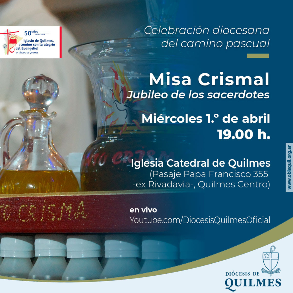 El miércoles 1.º de abril, en camino hacia la Pascua, la comunidad diocesana de Quilmes celebrará la Misa Crismal, Será a las 19.00 en la Catedral de Quilmes (Pasaje Papa Francisco 355 -ex Rivadavia-, Quilmes Centro) y se transmitirá en vivo por Youtube.com/DiocesisQuilmesOficial