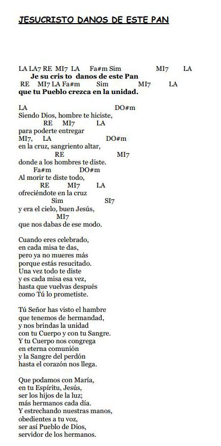 Comunión 20 A buen tiempo 21 Arriba los corazones 22 Como en Emaús 23 En memoria tuya 24 Haciéndote pan 25 Jesucristo, danos de este pan 26 Jesús eucaristía 27 Ven, hermano 28 Zamba para que te quedes
